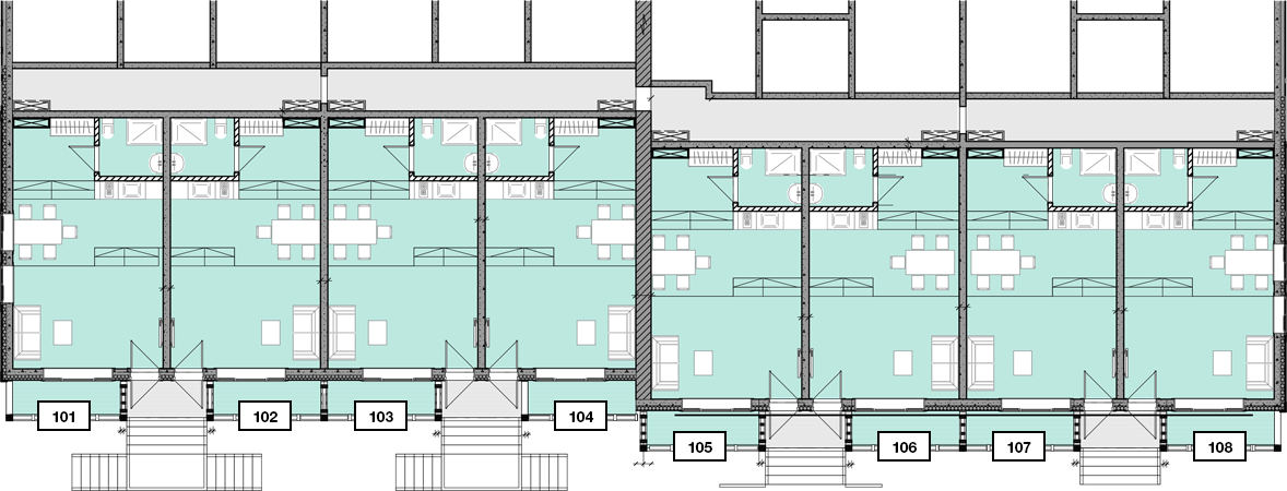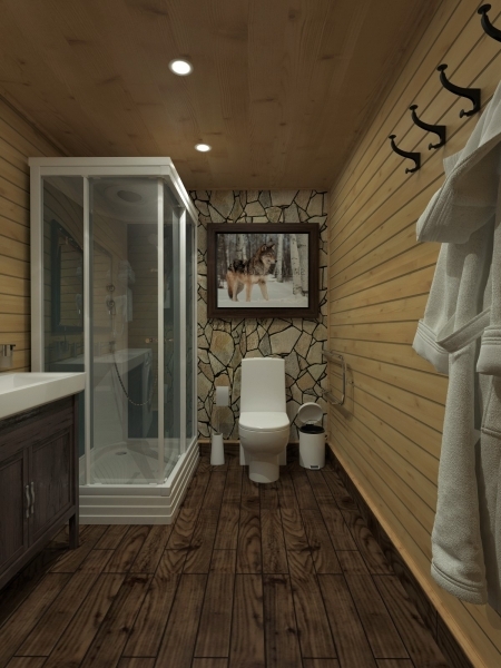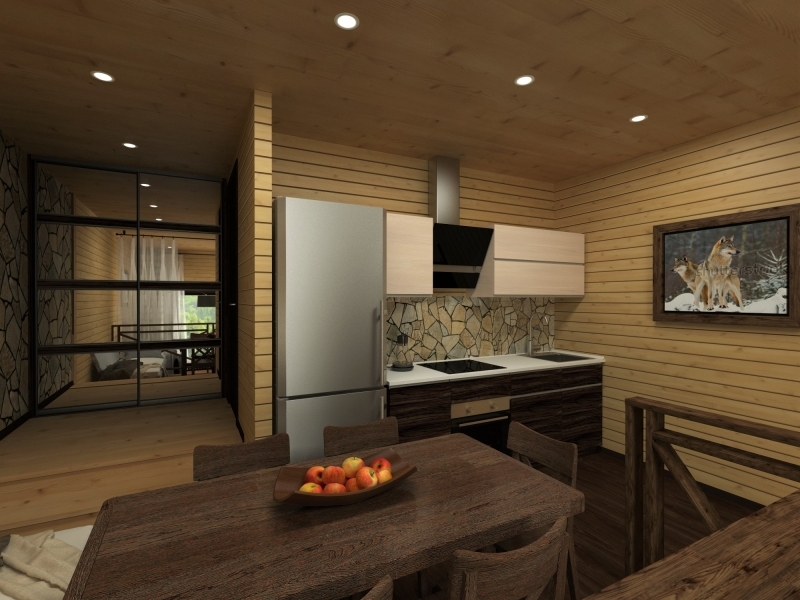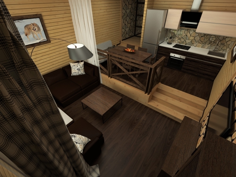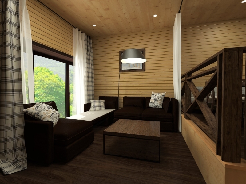 Апартамент с отдельным входом и большими панорамными окнами на озеро, расположен в части здания выполненной из монолита. Апартамент разбит на три функциональные зоны: гостиная, кухонная, гардеробная/санузел. Каждая из зон имеет свой уровень пола относительно предыдущей, столь необычная планировка грамотно обыграна дизайнером. Ниже представлена визуализация апартамента: