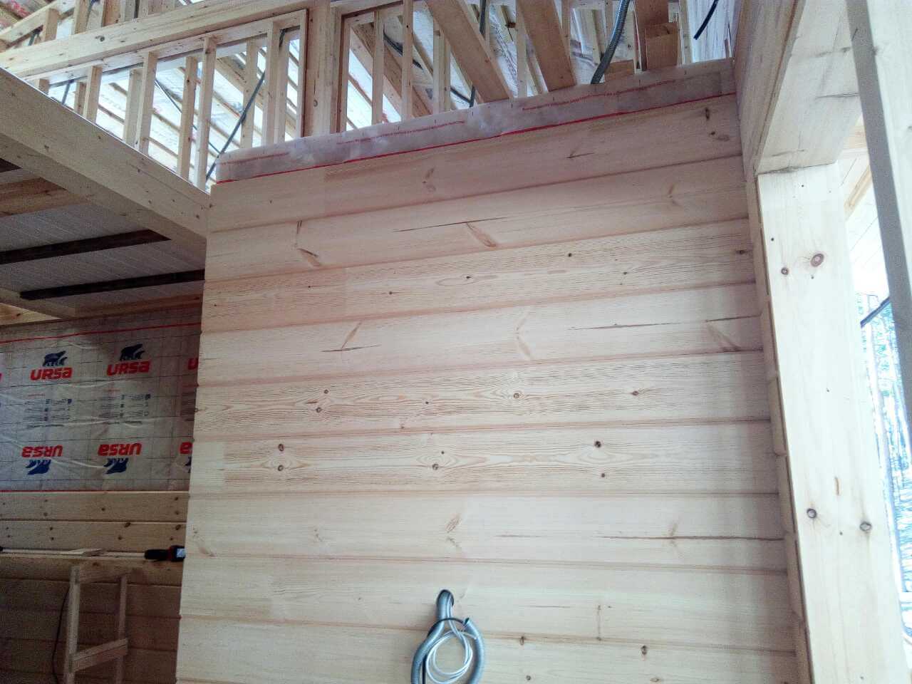 Внутри дома практически полностью смонтированы полы всех этажей. И в настоящий момент ведется утепление и зашивка перегородок фальшбрусом.