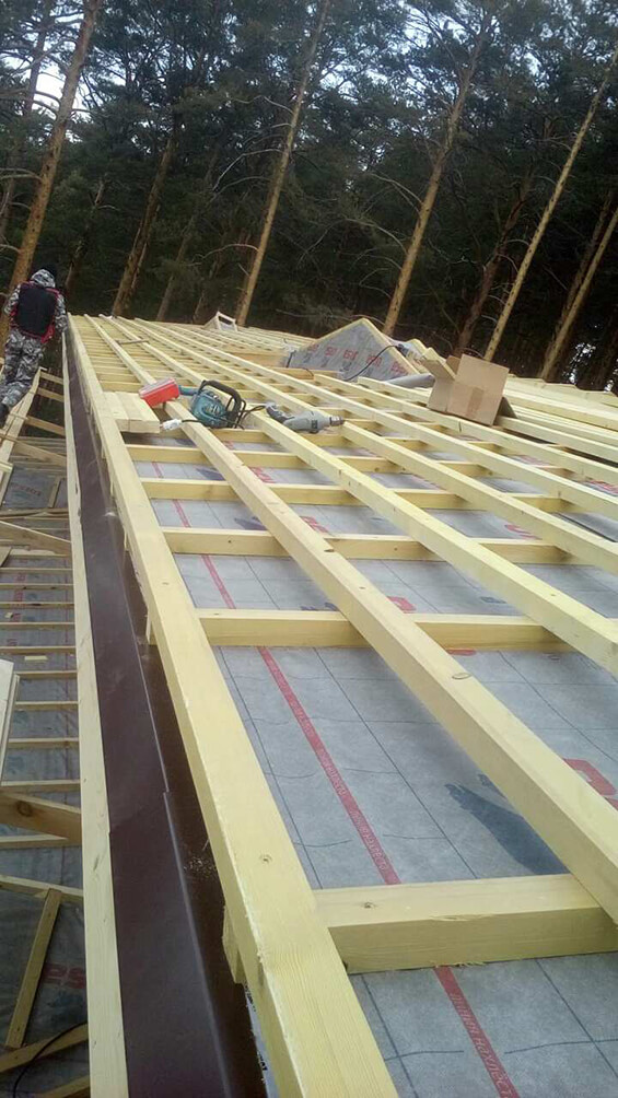 На текущем этапе полностью смонтирована конструкция крыши с утеплением и гидроизоляцией, а также начата работа по укладке черепицы.