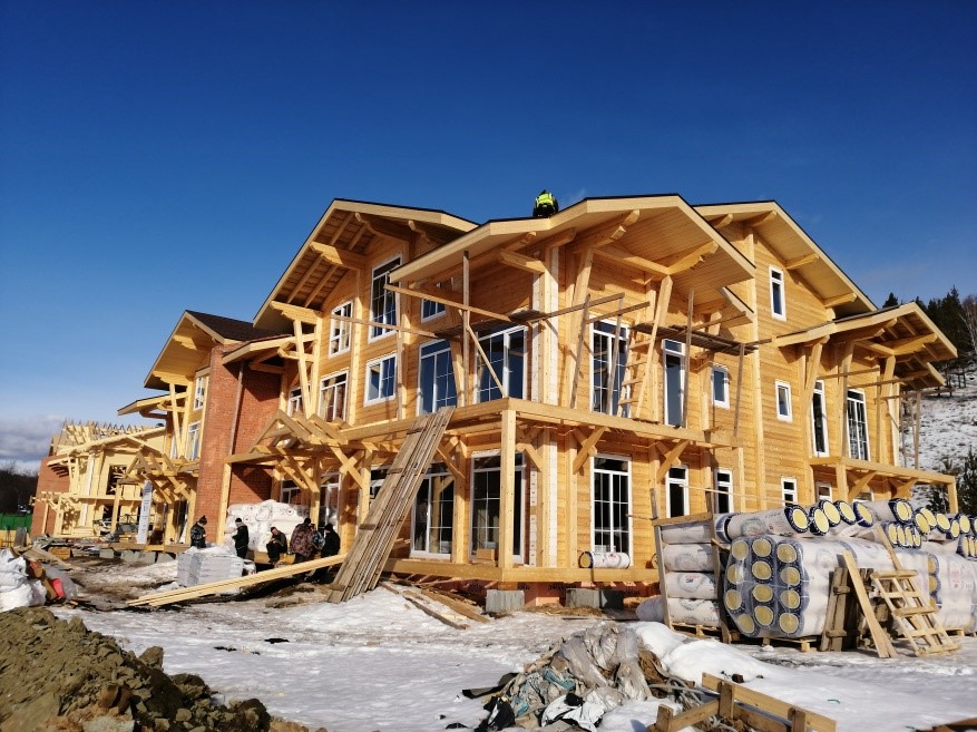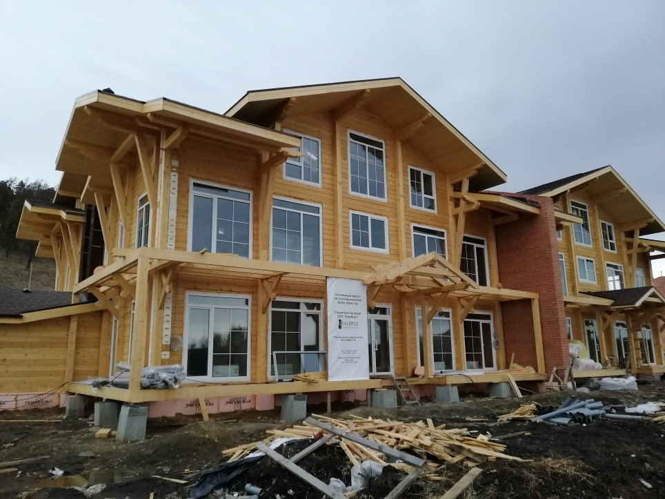 В 1 шале завершено устройство коммуникаций в полупроходном канале дома, ведутся работы по устройству стояков сетей отопления, водоснабжения и канализации. Также продолжается монтаж котельного оборудования. В первой секции зашиты полы 1-го этажа, ведется монтаж межкомнатных стен. Начинается остекление оконных проемов. Во второй секции ведется утепление пола.